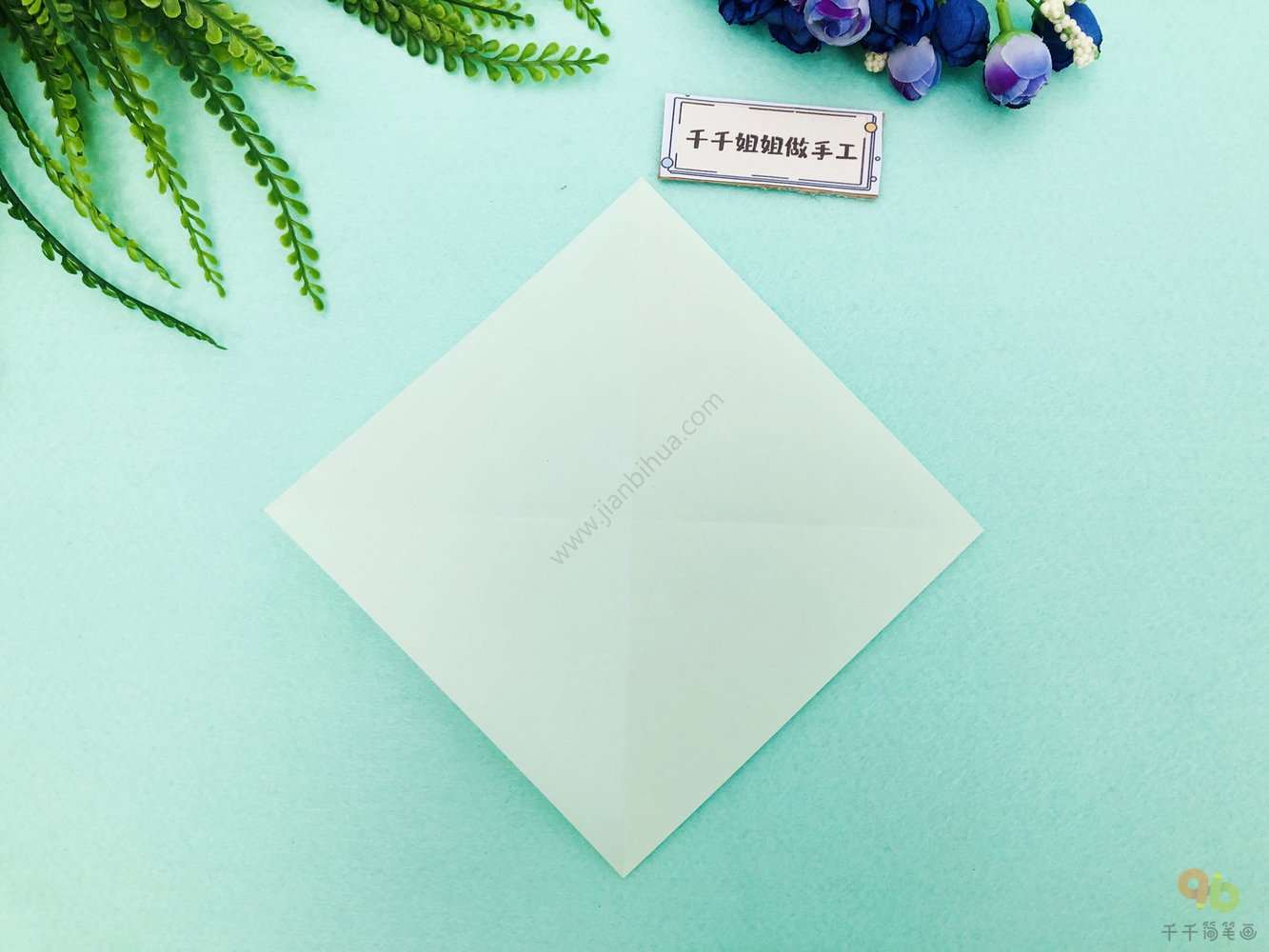 1、准备一张正方形卡纸,沿对角线折出折痕。