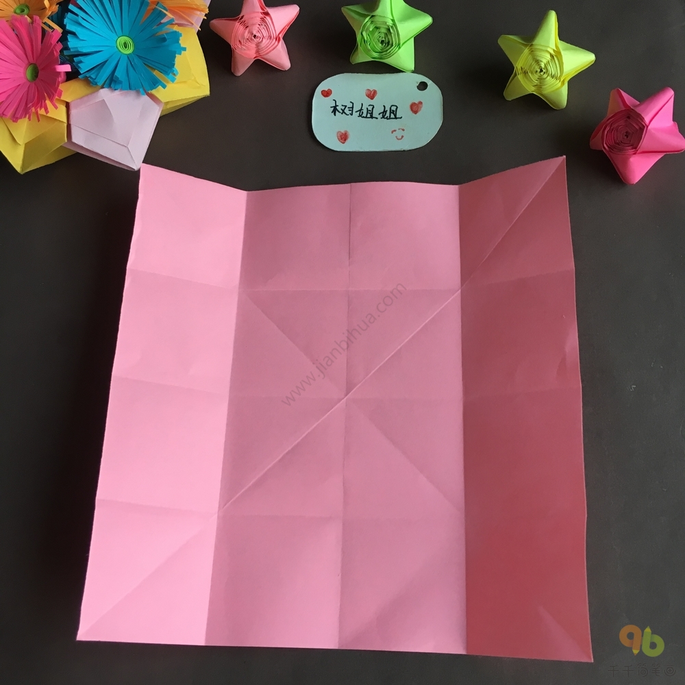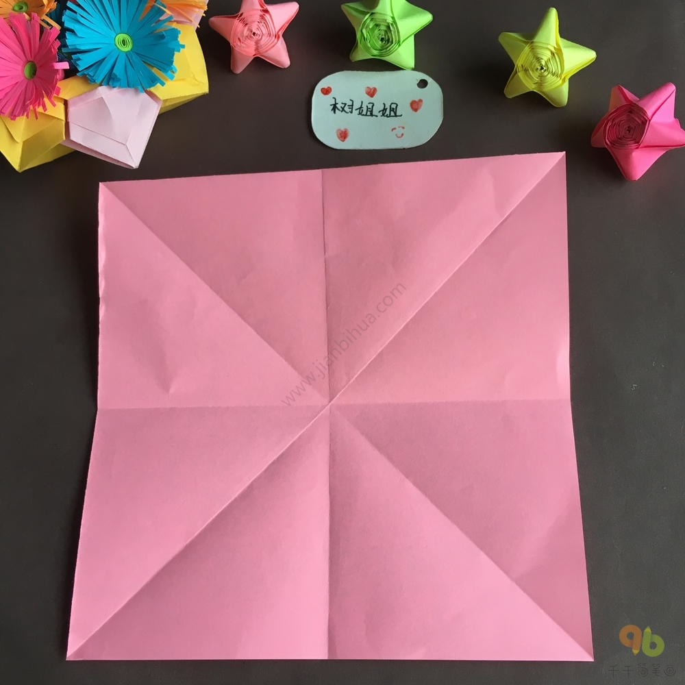第一步,我们将正方形彩纸折出米字折痕,如上图所示。