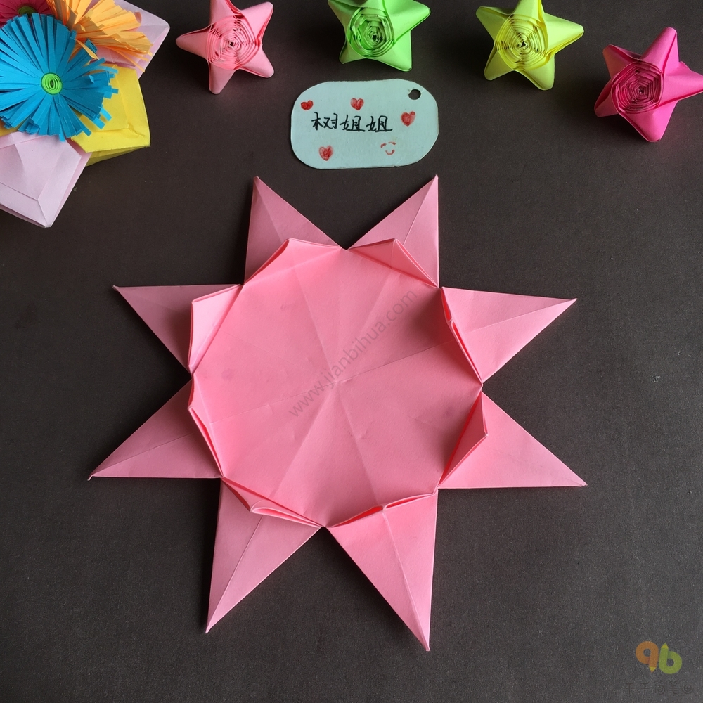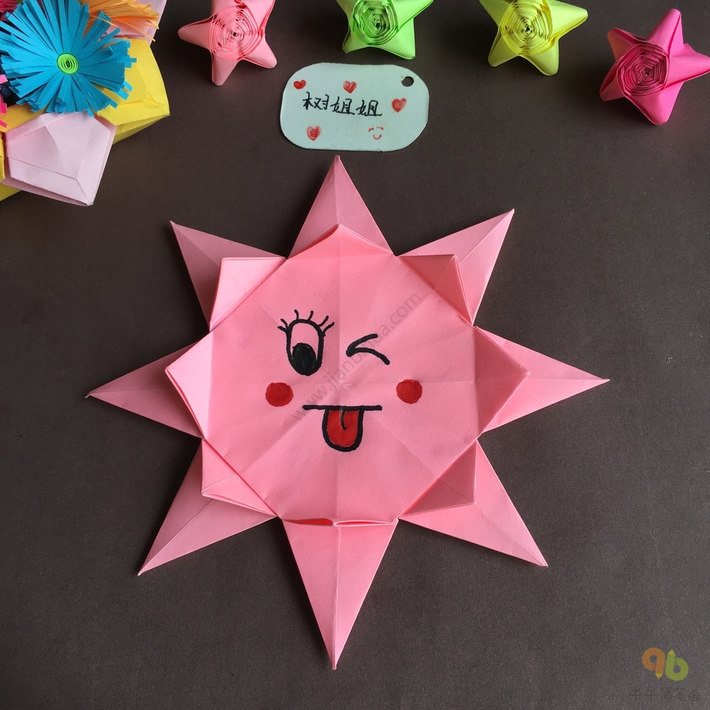 第十二步:我们在折纸的中间部分画上可爱的表情包,一个可爱的太阳宝宝折纸就完成了。