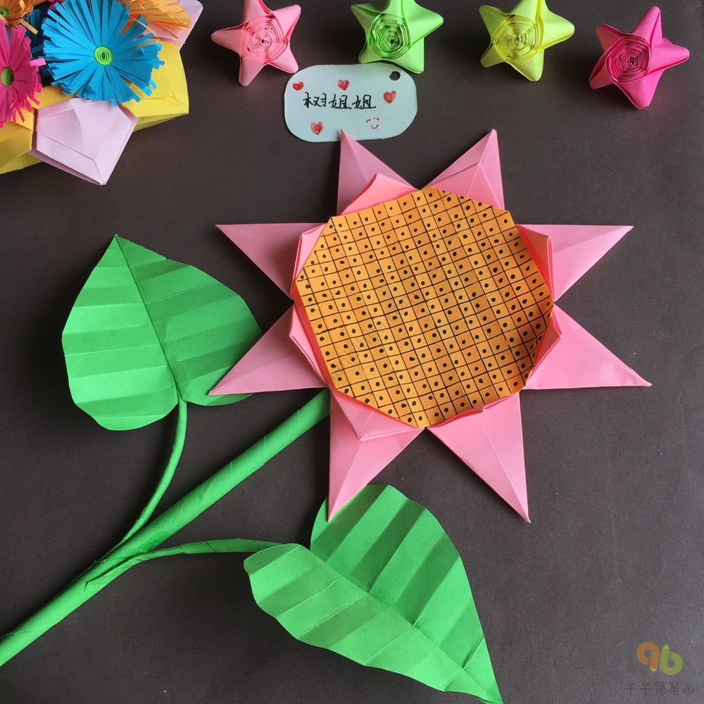 第十三步:我们还可以做一个花枝固定花朵,在圆盘中间选择1张1/4大小的正方形画出小葵花花蕊的样子,然后将4个直角向背面对折,固定在花朵中间,一朵超级可爱的小葵花就制作完成了。