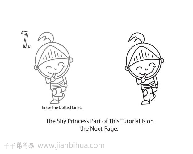 英文字母O画一位羞怯的骑士的简笔画,他旁边还有一位害羞的公主