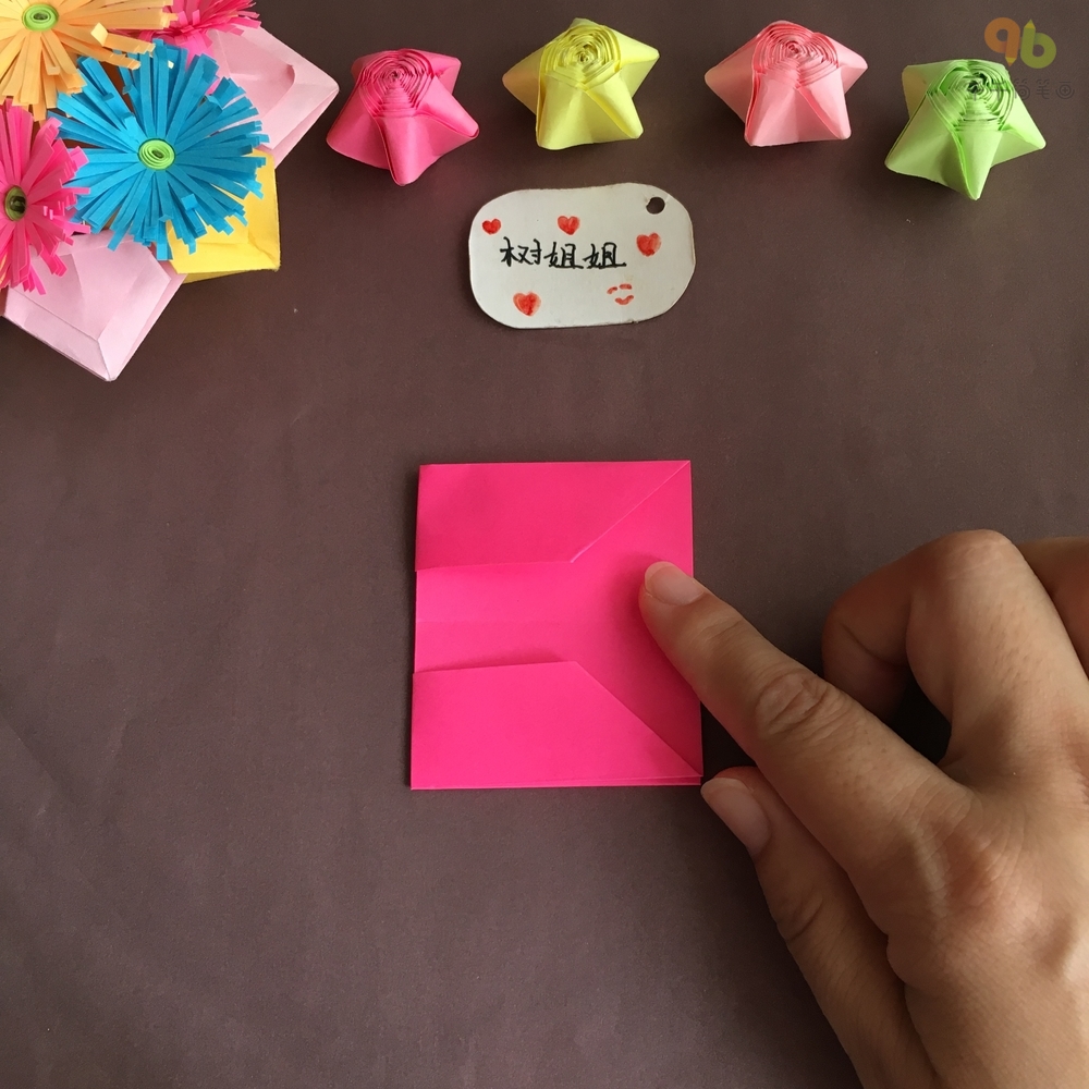 1、将正方形彩纸折出十字折痕,然后对折,如上图所示。