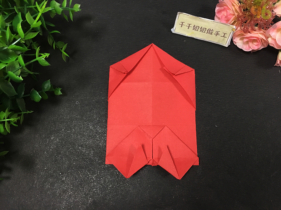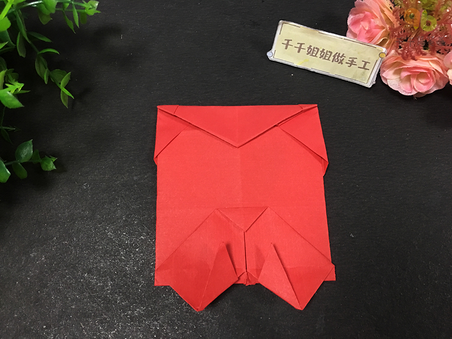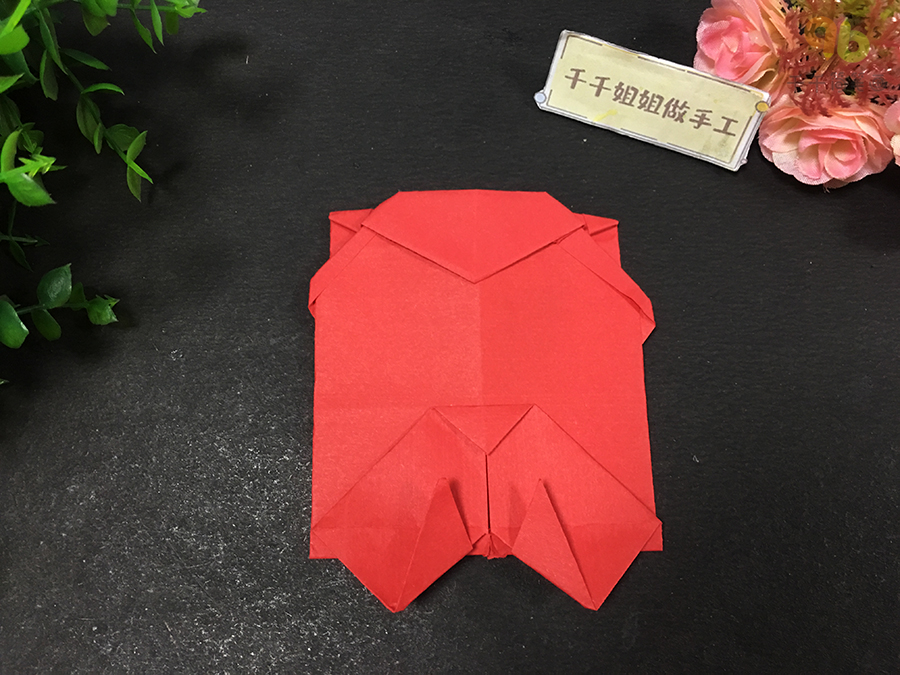 第十三步:将左右两端折纸向里翻折出来,折出狼人的耳朵