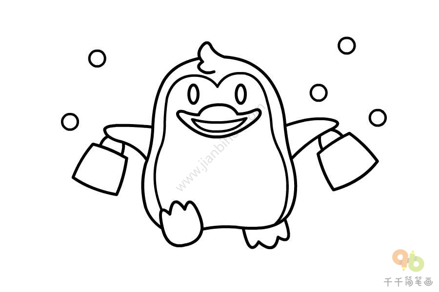 第五步:画出企鹅手里的物品,继续画出一些圆圈作为雪花